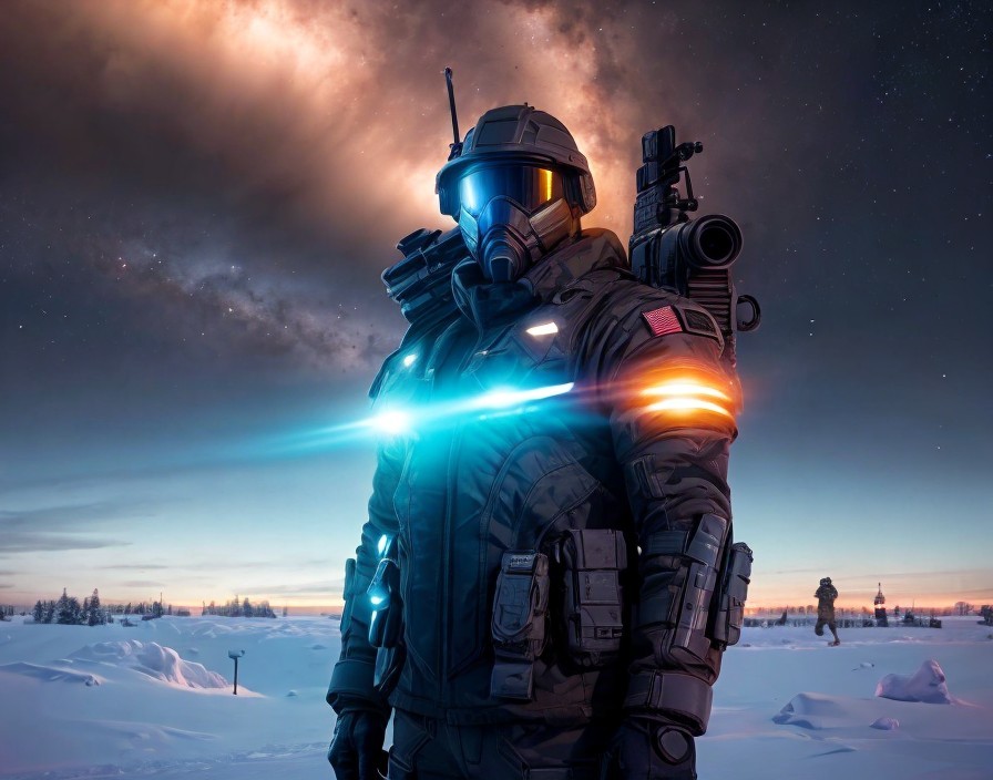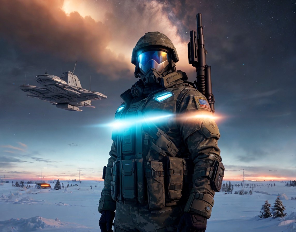 Soldier of future as massive man in eco suit with futuristic assault rifle on post apocalyptic background in winter Siberia, gigantic space ship in the sky far above