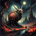 A surreal scene featuring figures entwined in vibrant foliage and tomatoes, with a mystical moon overhead. The characters wear helmets, blending nature and humanity in an enchanting atmosphere.
