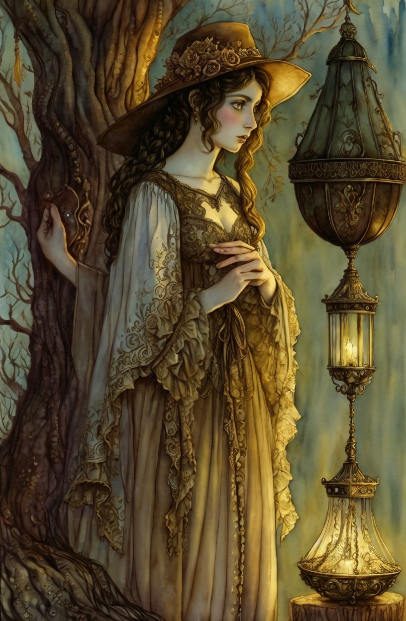 Woman in vintage dress and hat beside ornate lamp in forest at twilight.