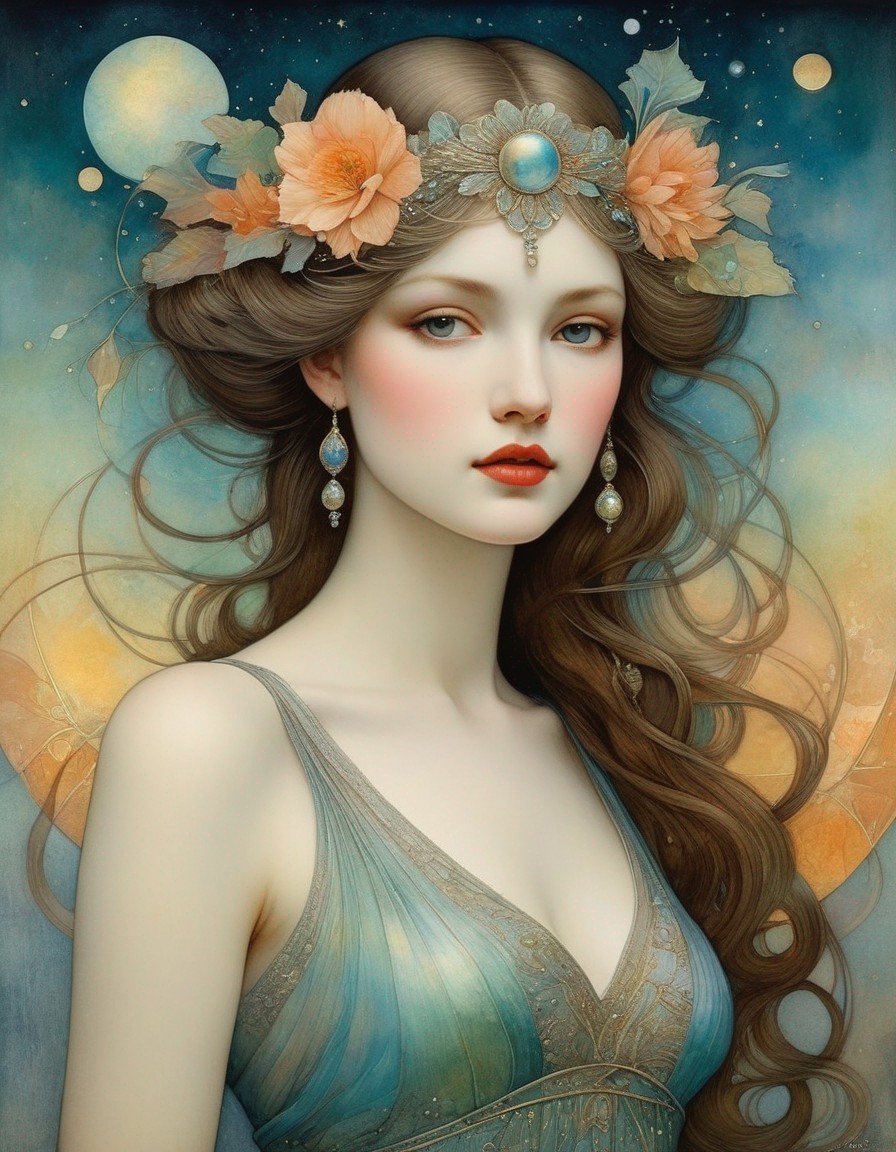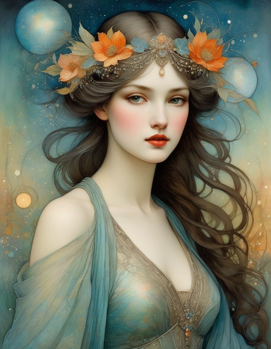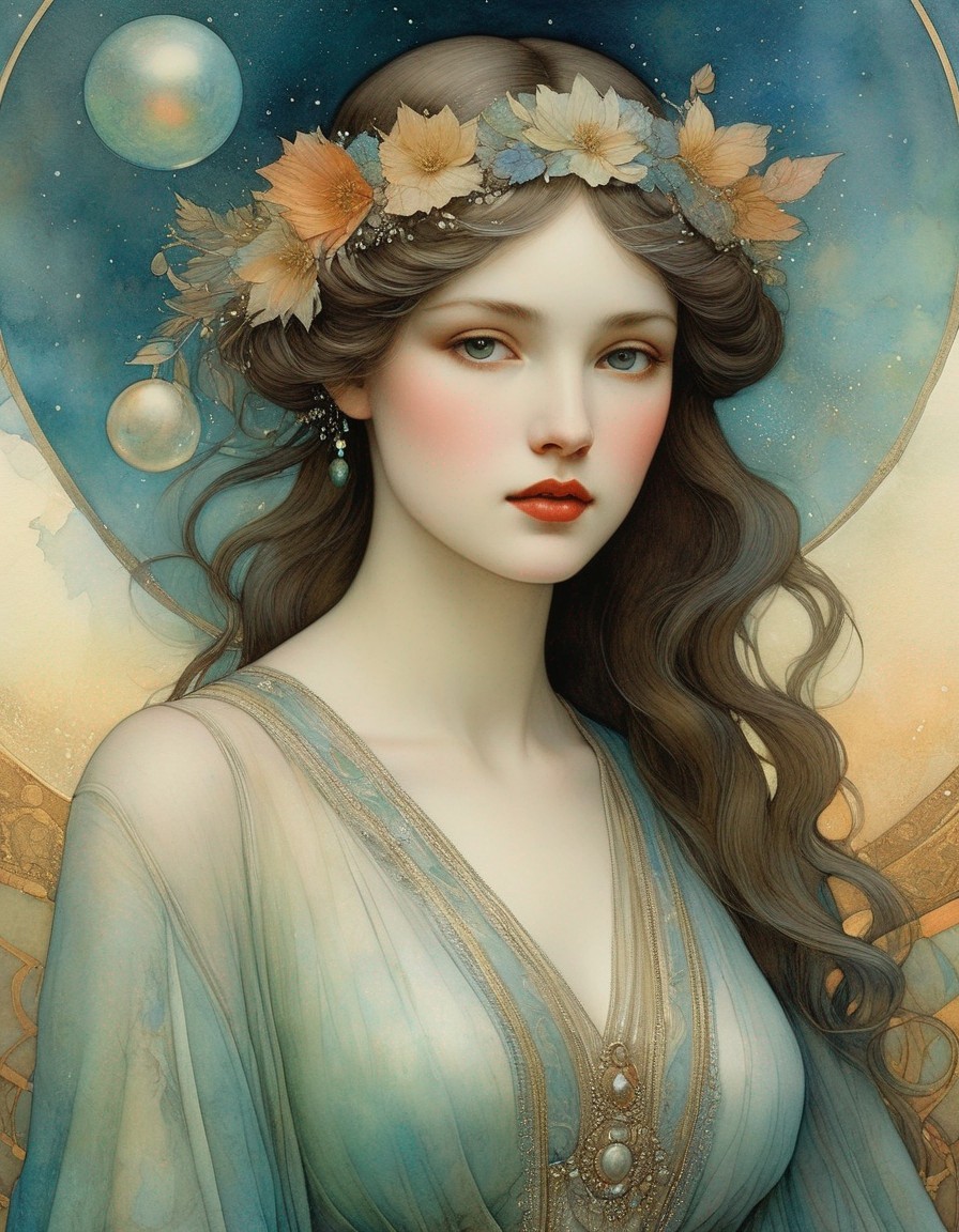 Prompt: Iridescent watercolor and ink By Jamie Heiden, Daniel Merriam, Paul Klee, Karol Bak, Dee Nickerson, extremely detailed, high definition, crisp quality, ultra detailed background art nouveau New Year’s Eve ball.