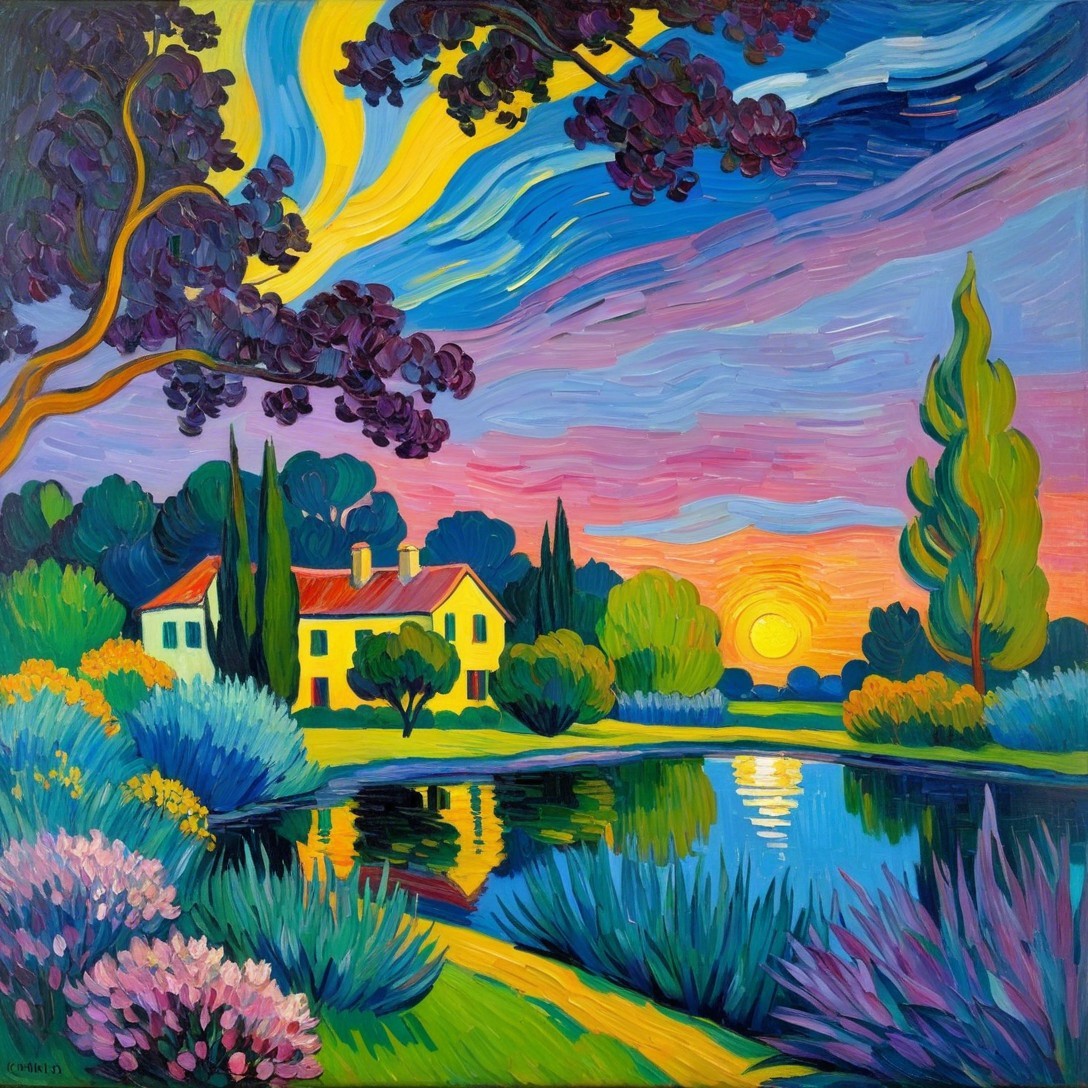 A vibrant landscape features a serene river reflecting the sunset and a charming yellow house surrounded by lush trees and colorful flowers, all set against a swirling sky of blues and golds.