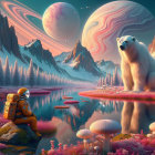 An astronaut sits by a serene river surrounded by vibrant flowers and towering mountains. A majestic polar bear approaches, while ringed planets float in a pastel sky above.