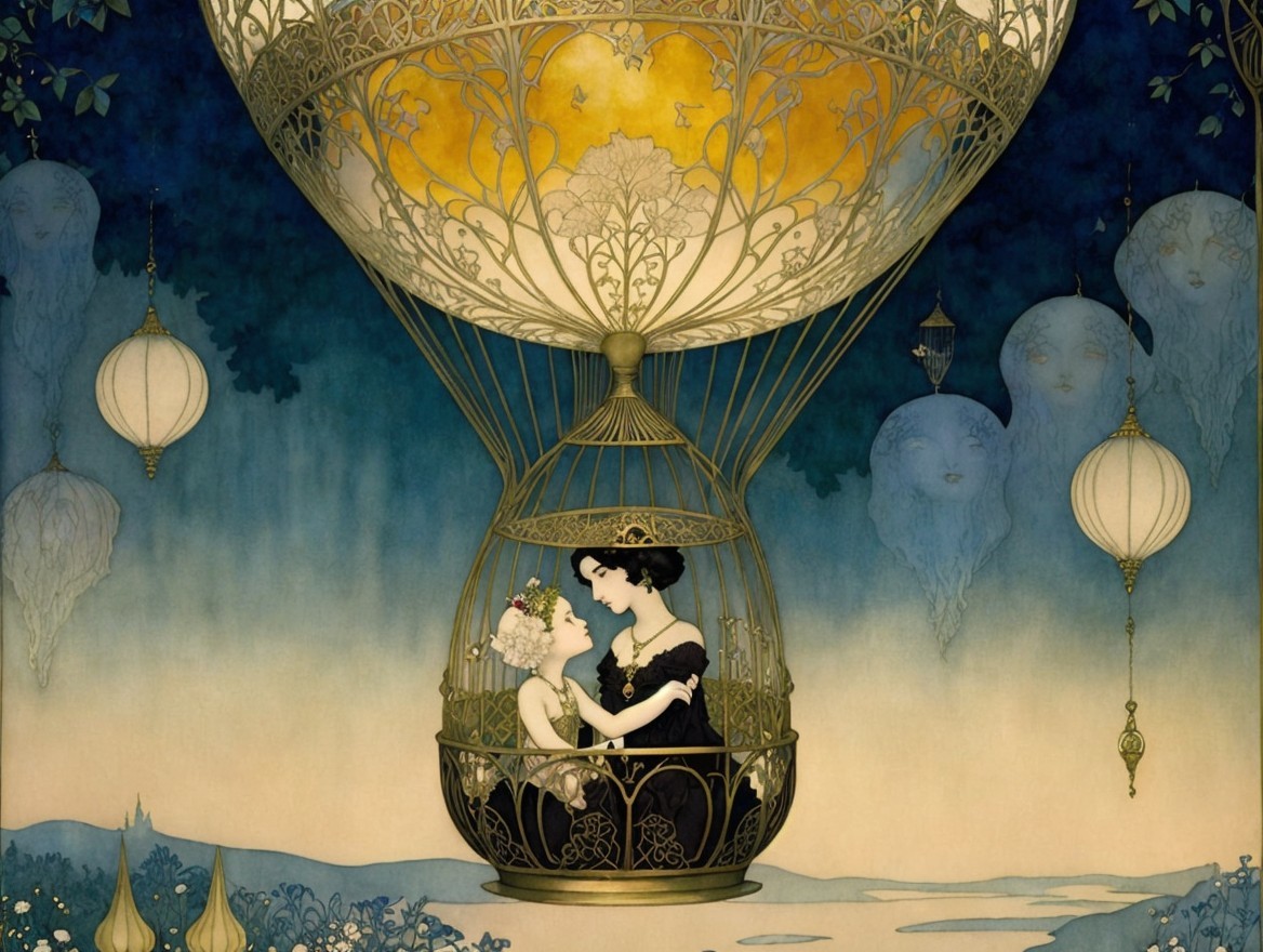 The image features an elegant, surreal scene: a woman in a black gown inside an ornate hourglass, with a celestial figure above her and a dreamy, starry backdrop of distant landscapes.