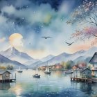 Tranquil Lake Sunset Landscape with Cherry Blossom