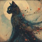 A mystical black cat stands against a luminous full moon, its flowing fur blending with swirling watercolor hues. Delicate trees frame the scene, creating an enchanting, dreamlike atmosphere.