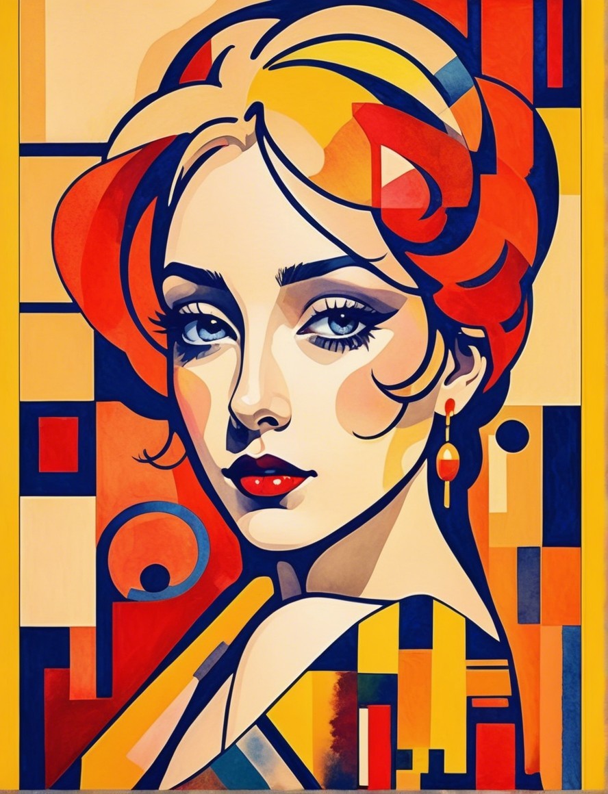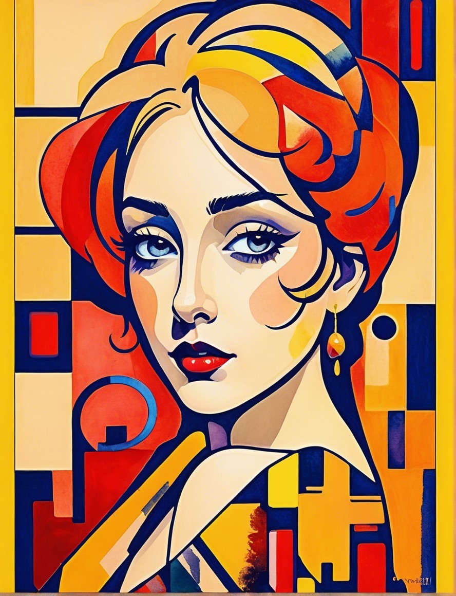 A vibrant, stylized portrait of a woman with striking features and red hair, surrounded by bold geometric shapes and warm colors, giving a modern, artistic vibe.