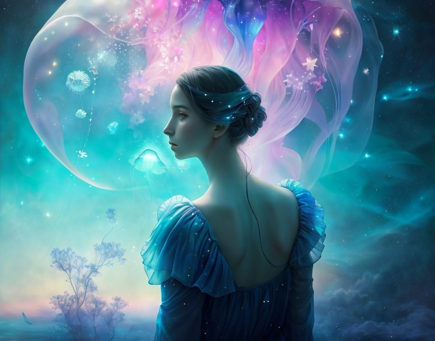 The dreamer shown in full figure from behind looks at the sky full of floating iridescent bioluminescent transparent jellyfish among the stars. Lots of jellyfish. Fantasy painting. In the style of art of Reylia Slaby, Catrin Welz-Stein and Jean Baptiste Monge. Magic surrealism, vibrant pastel colours, blue tones, magical, enchanting, ethereal, dreamy.