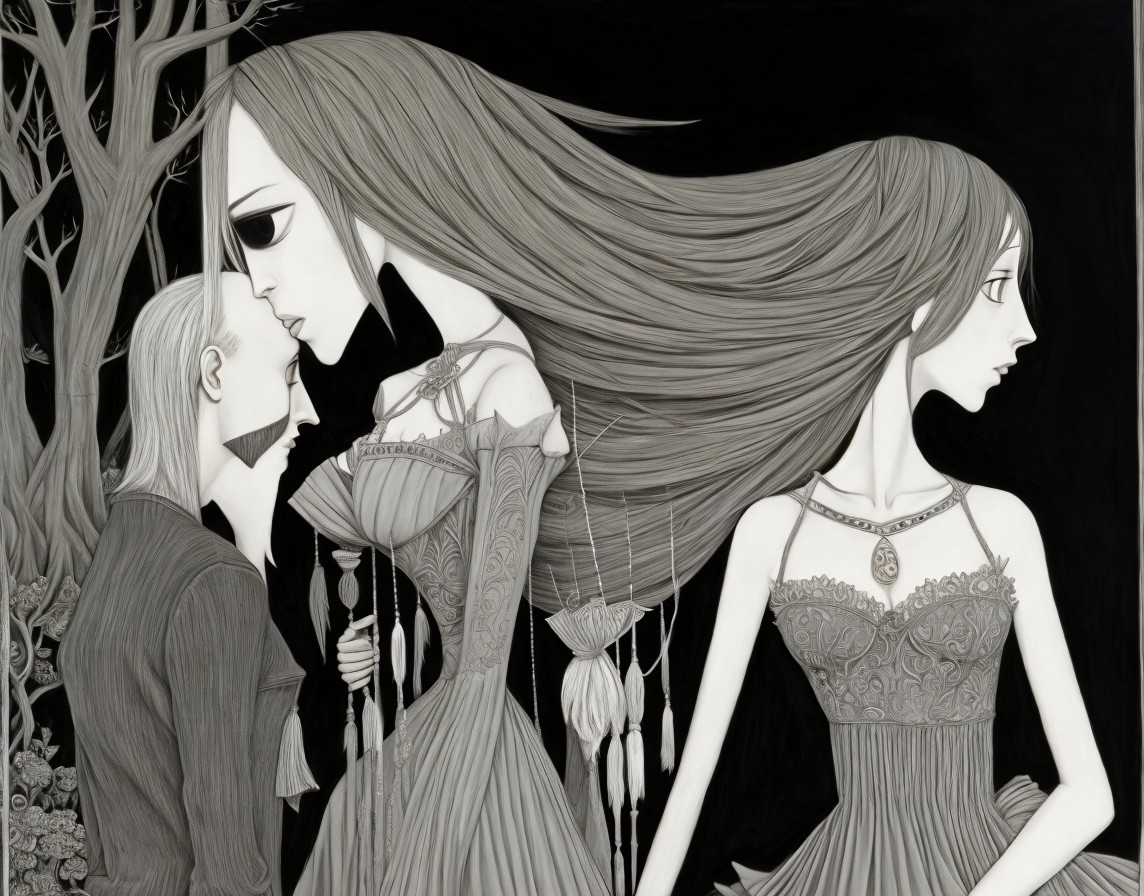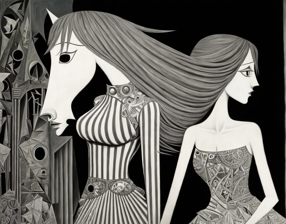Monochrome surreal artwork with stylized figures, where disjointed characters with elongated features are amidst abstract shapes.