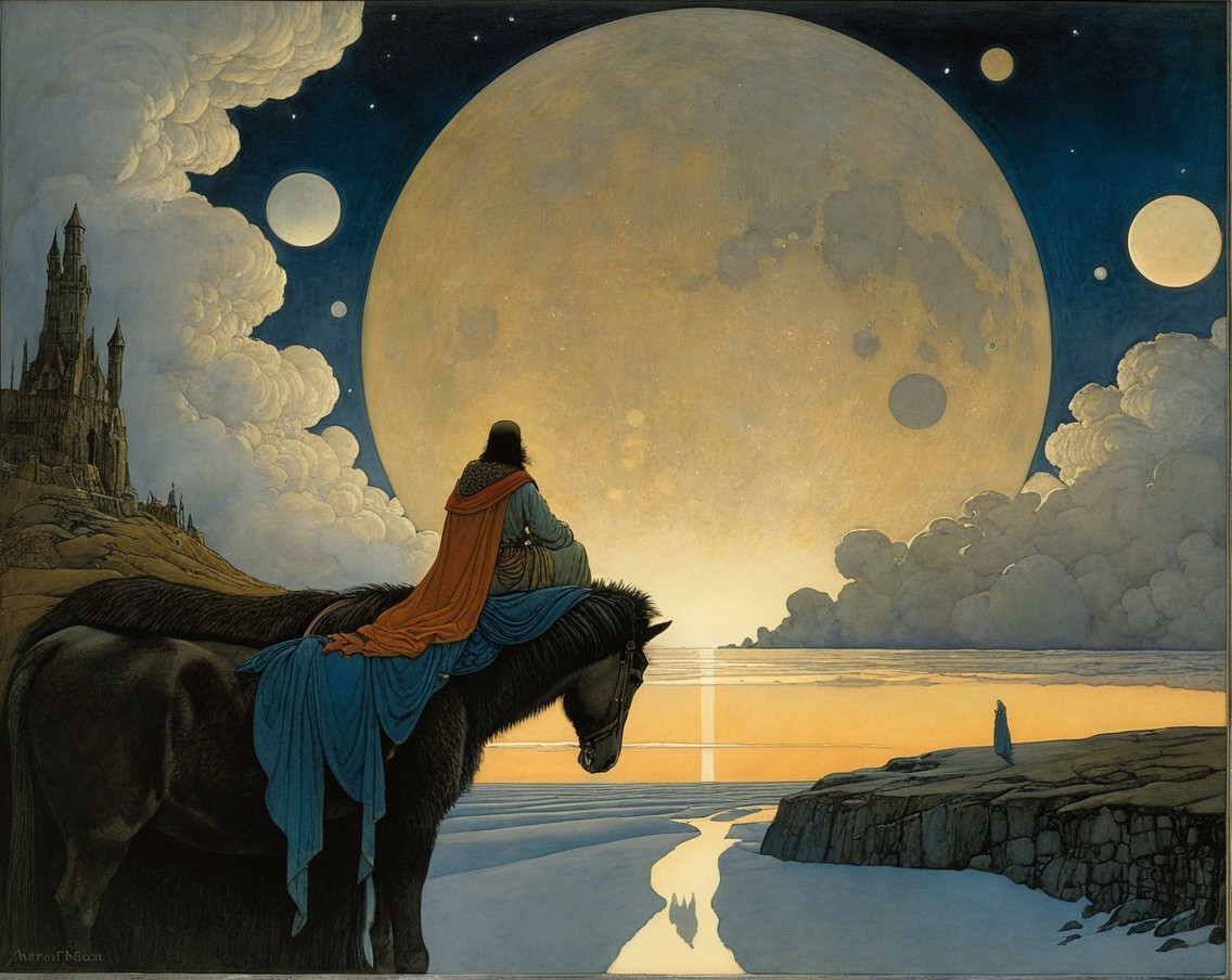 A vast landscape features a large wolf next to a figure in a cloak, gazing at a giant moon over distant mountains and a castle. The sky is filled with clouds and stars, creating a mystical atmosphere.