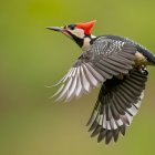 Two woodpeckers perched on a tree branch, showcasing their vibrant plumage. One is pecking at the wood while the other observes, surrounded by lush green foliage. Nature's beauty on display.