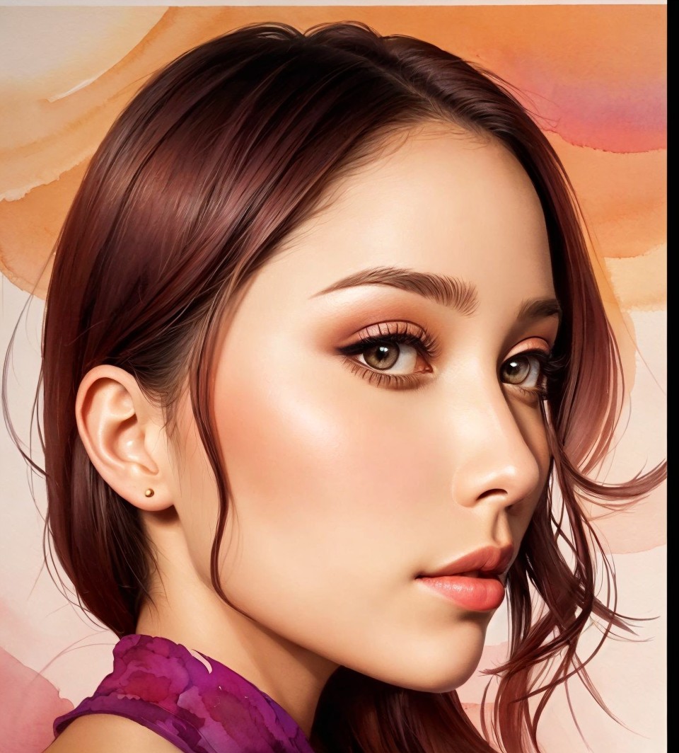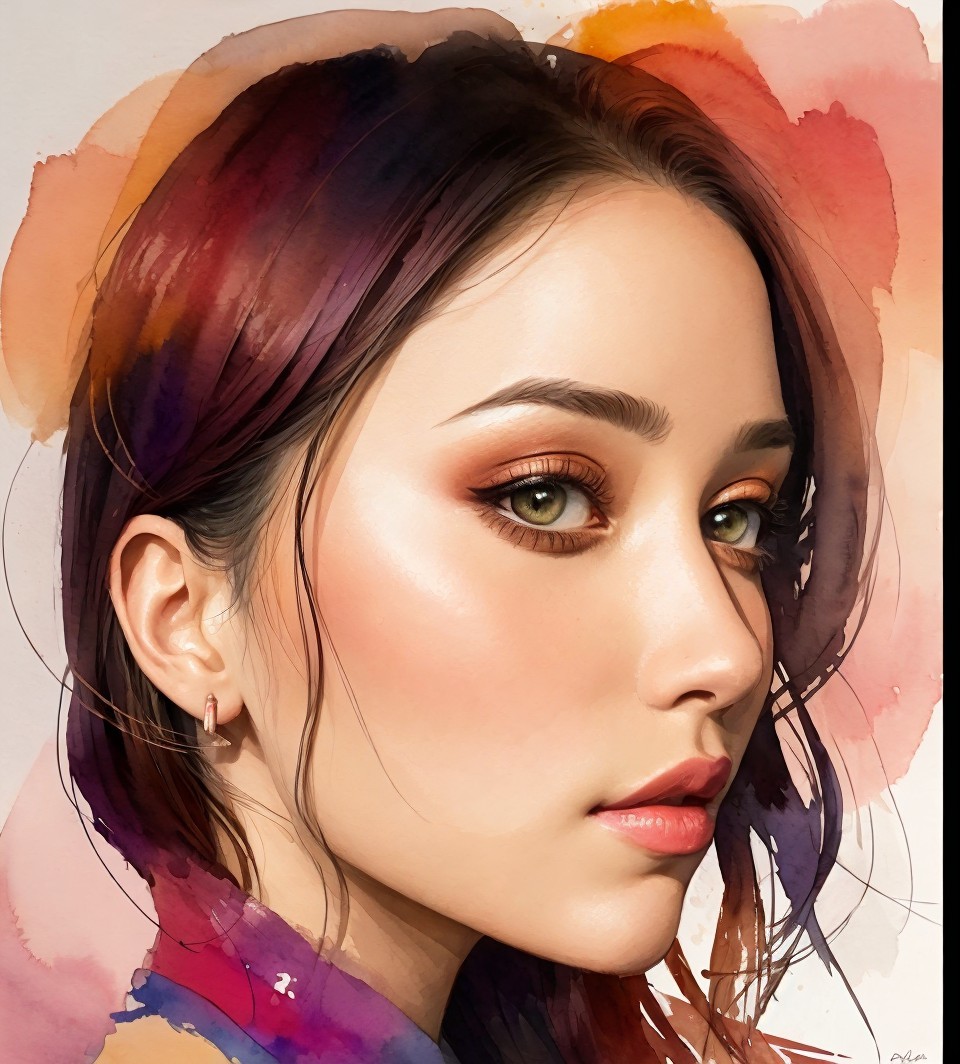 Portrait of beautiful female, Head is stylized lineage, wavery watercolor currents, thick impasto, tints of inkpunk, 333389 DE5D83 FFFF99 8706CE 157245, fine tiny strokes, stylized lineage illustration, brightness 1.9, zentangle lines, abstract style, brushed strokes, exaggerated spatiality, vibrant colors, anisotropic filtering 1.7, dynamic lighting 1.9, grain, Schreger lines 1.7, ambient occlusion, intricate ornamental iridescence, triadic color scheme auburn beige mauve,tints of Arthur rackham and Overton Loyd, custom_loss: edge,stylized illustration 1.8