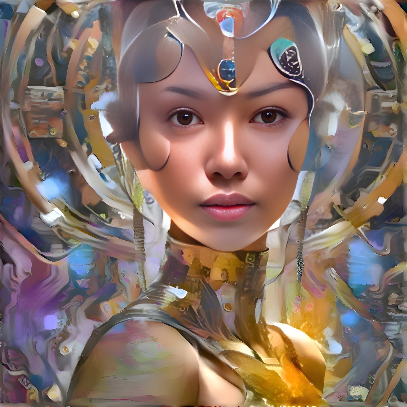 A surrealistic and fantastical digital painting depicts a cybernetic fairy with red hair and glowing insect wings, flying through a digital realm. The fairy has a human face adorned with cultural markings, and is encased in a clear acrylic helmet with ornate, golden deer antlers emerging from the sides. The fairy’s