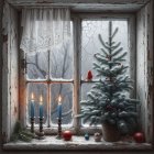 A cozy winter scene featuring a decorated Christmas tree and three lit candles on a windowsill. Snow gently falls outside, enhancing the warm, festive atmosphere indoors.