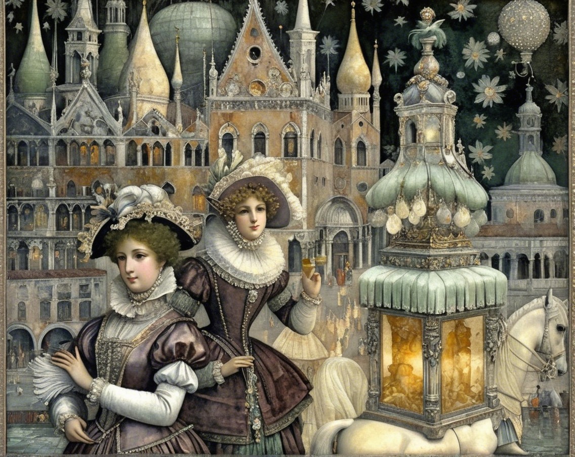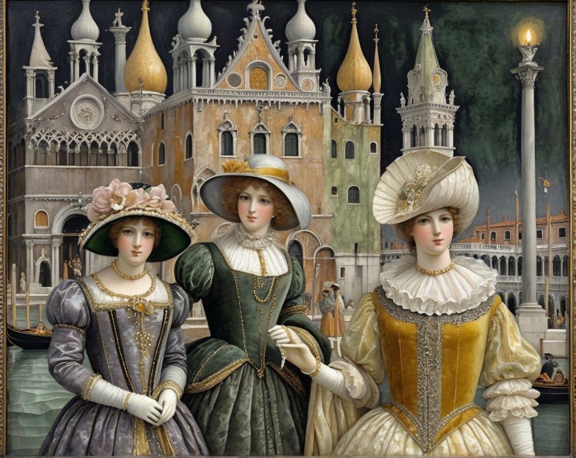 Girls at Carnival in Venice , 3rd century Venetian miniature art, Velvet blush olive green, sage, Shabby, Dull Gold, Amber Gray, marbled. dramatic