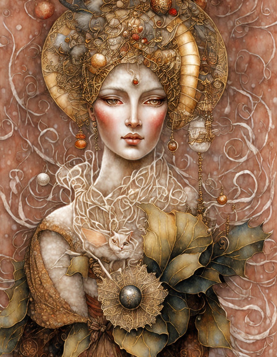 Fantasy illustration of pale-skinned woman with ornate headdress and chest piece