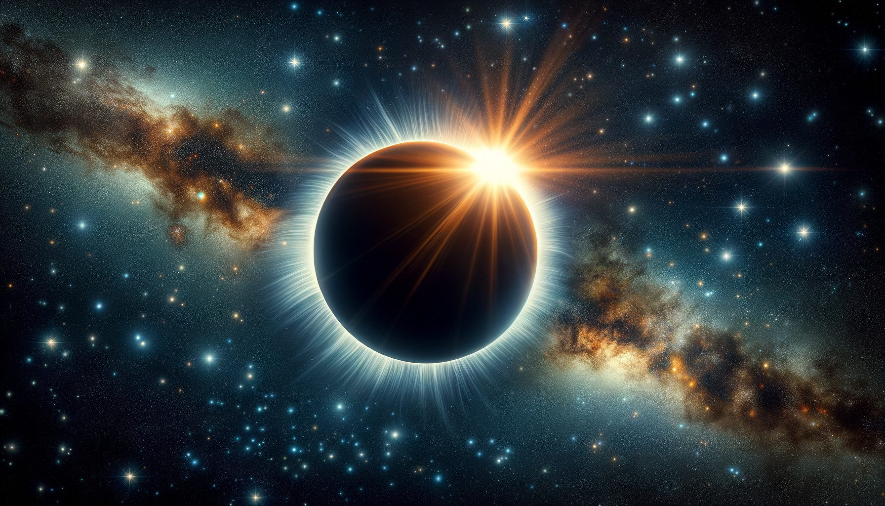 Radiant solar eclipse with corona, starry background, and cosmic dust clouds.