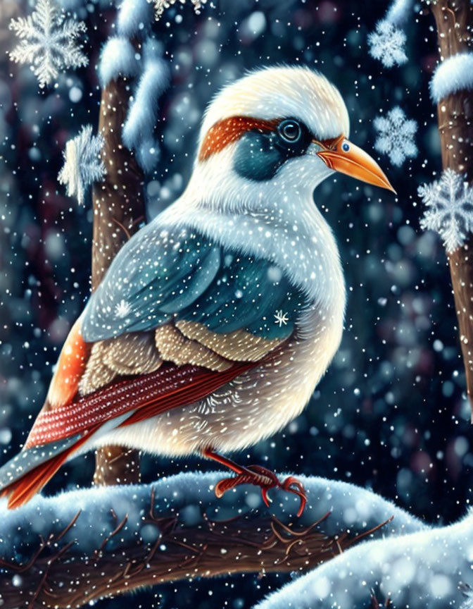 Bird with Santa Hat on Snowy Branch with Christmas Decorations