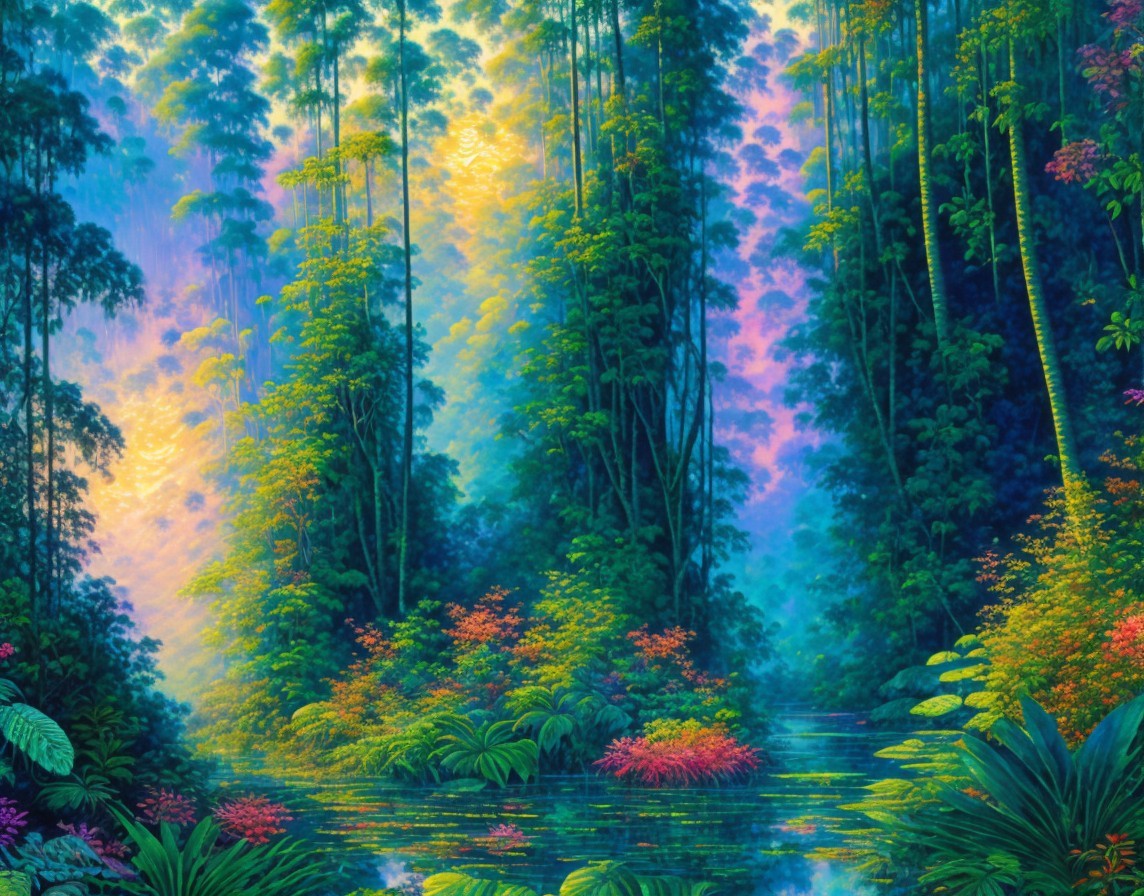 A vibrant, mystical forest with tall trees, colorful foliage, and a serene misty atmosphere, creating an enchanting dreamlike setting.