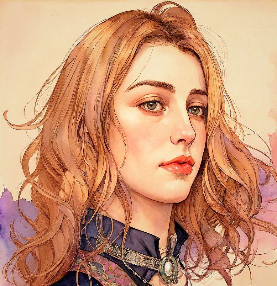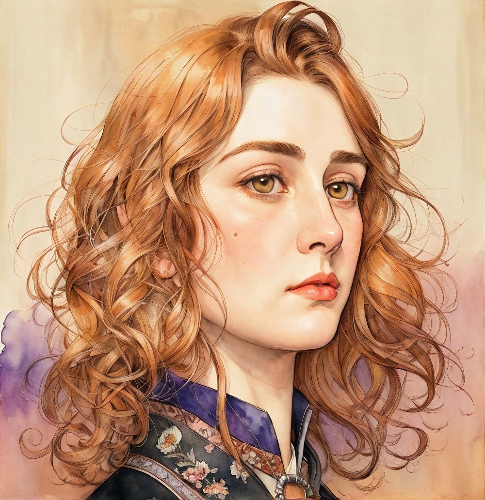 watercolor and ink portraiture, upper body portrait with stacked-up perspective, face emerging from chaotic background, art nouveau illustration, american gothic 1.9, softened dynamic lighting, tiny brushstroke fields, Stylized Art nouveau portraiture by Waterhouse, Egon Schiele, Milo Manara, timlin, Bagshaw, geof darrow, Arlie Opal, O'Keeffe, perfect eyes, tetradic color scheme Emerald brown ochre beige, highly coloured illustration, dynamic pose, drawn with ink and softened watercolor, splashing, blotting quill pen, scruffy aquarelle, intricate hairstyle details, swirls, muted colors, 3d effects 1.8, ambient occlusion 1.5, anisotropic filtering 1.3, raytraced shadows 1.8, sublime, serene, occult, Anglo gothic 1.9, american gothic 1.7, dynamic lighting 1.7, hues, plasticity 1.6, somber, stylized lineage illustration, geometrical features, octane render, bright luminous iridescence, triadic color scheme beige brown orange, delicate soft sunlight from top, soft rounded edges, retrofuturistic, intricate stylized lines, detailed composition, stylized facial features, subtle coloring, artistic ,synthetic, modern, abstract, chic.,traumacore 1.9, style of 1970s advertising art, delicate coloring 1.9, bokeh effects 1.8, brightness 1.9, vector 9:5, juvenile, weary,grain, Schreger lines 1.7, ambient occlusion 1.9, anisotropic filtering 1.7, luminosity 1.3, dethereal, raytraced shadows 1.8, heretic, radiance, maximalism, biomorphic details, atmospheric,