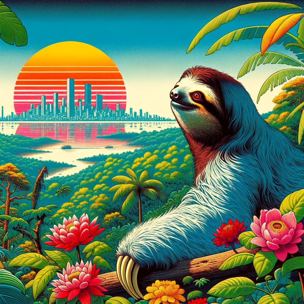 Prompt: "A sloth as arrived to the end of a jungle, he sees in a far distance a big city. He looks at the big city, his facial expression is “WOW”. multi-color woodblock print, Japanese moku hanga style. Ukiyo-e. Exceptionally detailed unusual realistic, style of Andy Farkas, Mio Asahi, Koji Ikuta, Oleg Denisenko. very attractive. high definition . very beautiful color"