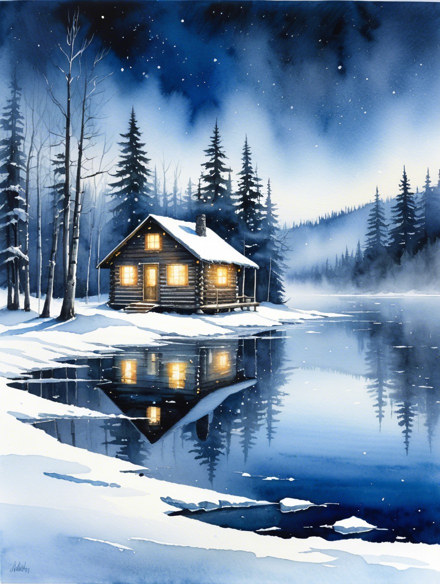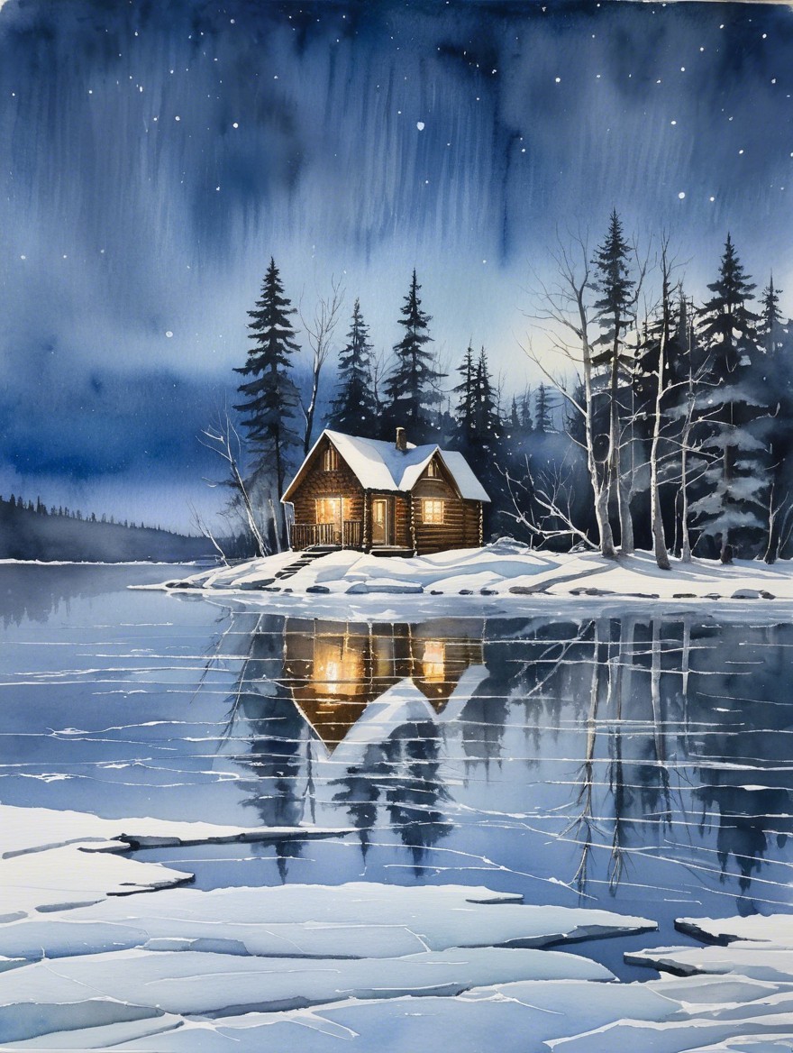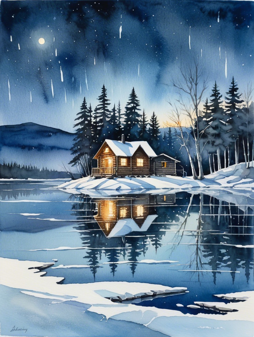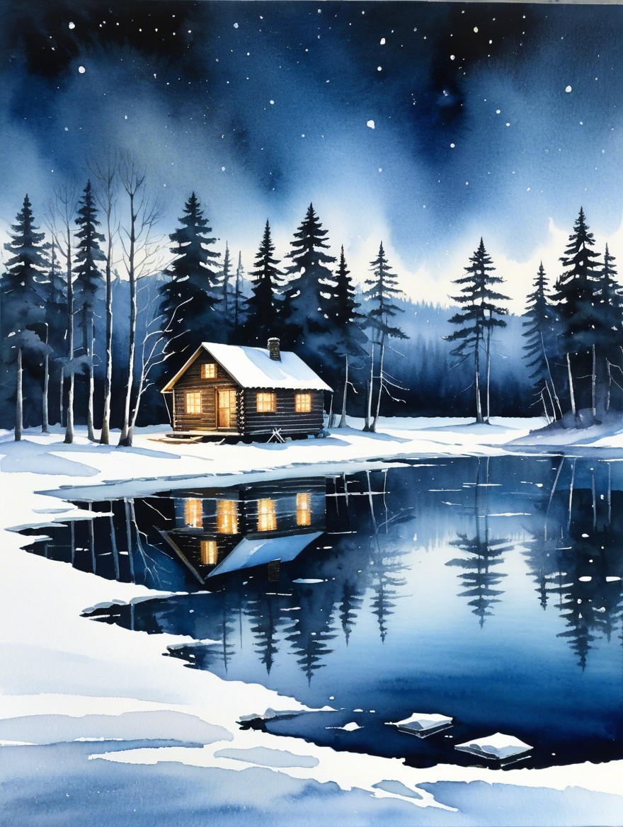 A cozy wooden cabin nestled by a shimmering lake, surrounded by snow-covered mountains and evergreens. Children play by the water, with twinkling stars and a glowing sunset in the sky.