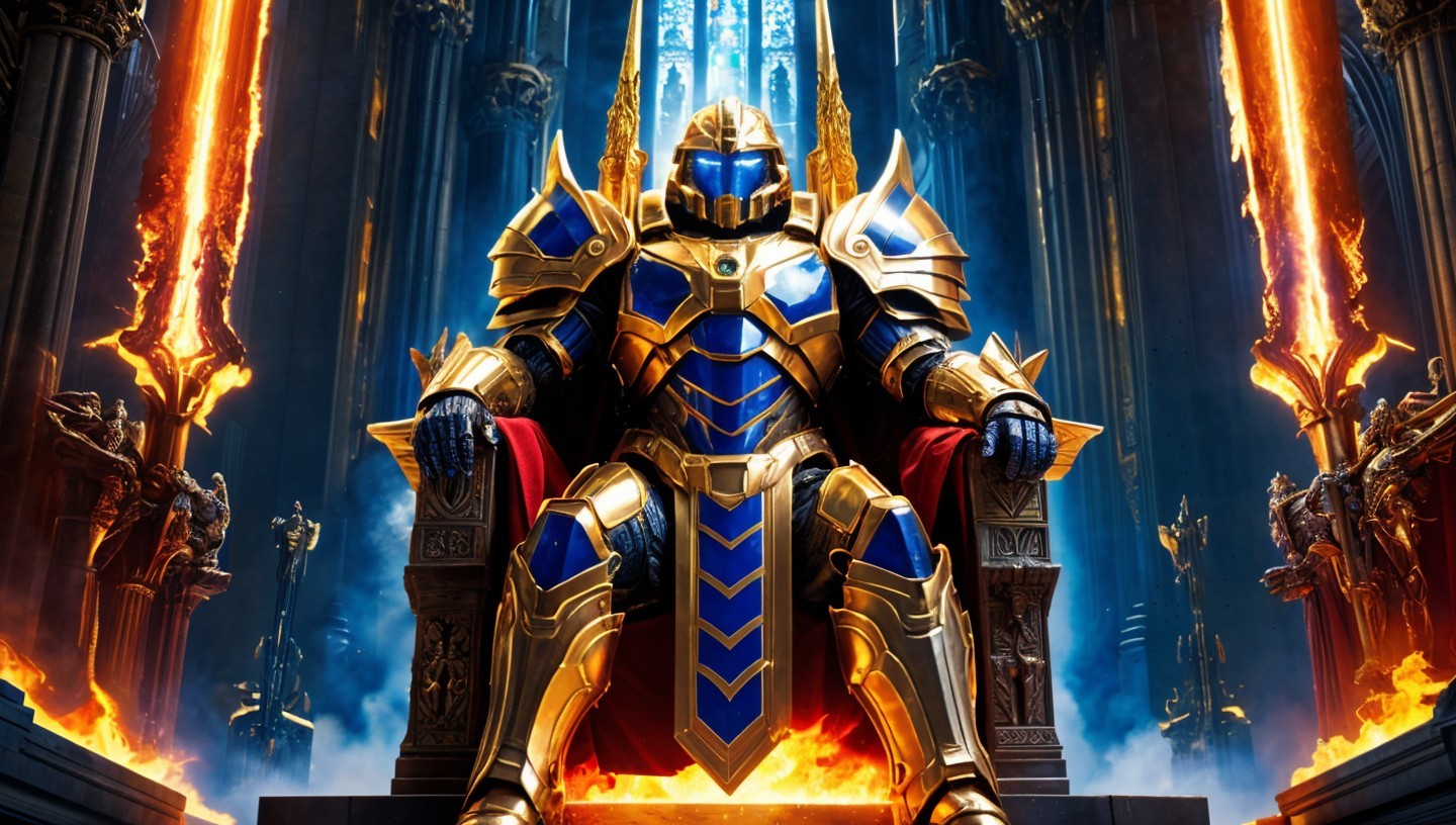 Golden armored God Emperor of Mankind, colossal ornate throne, flames engulfing aura, intricate power armor details, glowing eyes, regal pose, majestic cathedral backdrop, futuristic sci-fi setting, epic battle scars, halo above head, massive sword, ancient symbols, dramatic lighting casting shadows, vibrant gold, deep reds, royal blue, silver, artistically detailed, high-resolution digital art, dynamic perspective, war-torn universe vibes.