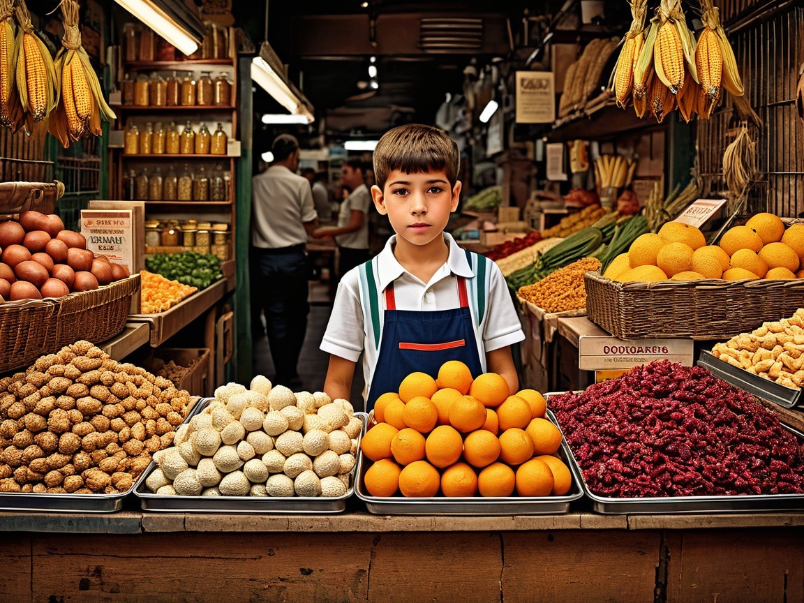 A close-up view of a young boy standing behind a stall brimming with fresh produce in a bustling market, a wide array of vibrant fruits and vegetables meticulously arranged creating a captivating visual tapestry.