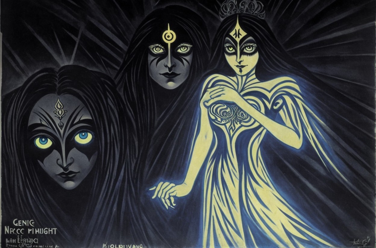 A vintage poster with two stylized women, featuring prominent eyes and mystical motifs, radiating with enigmatic energy. German expressionist film as inspiration.