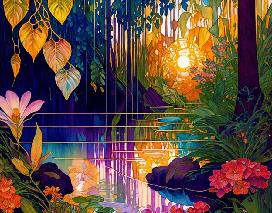 An artful depiction of a lush, colorful garden with a setting sun peeking through dense foliage and flowers, casting a warm glow.