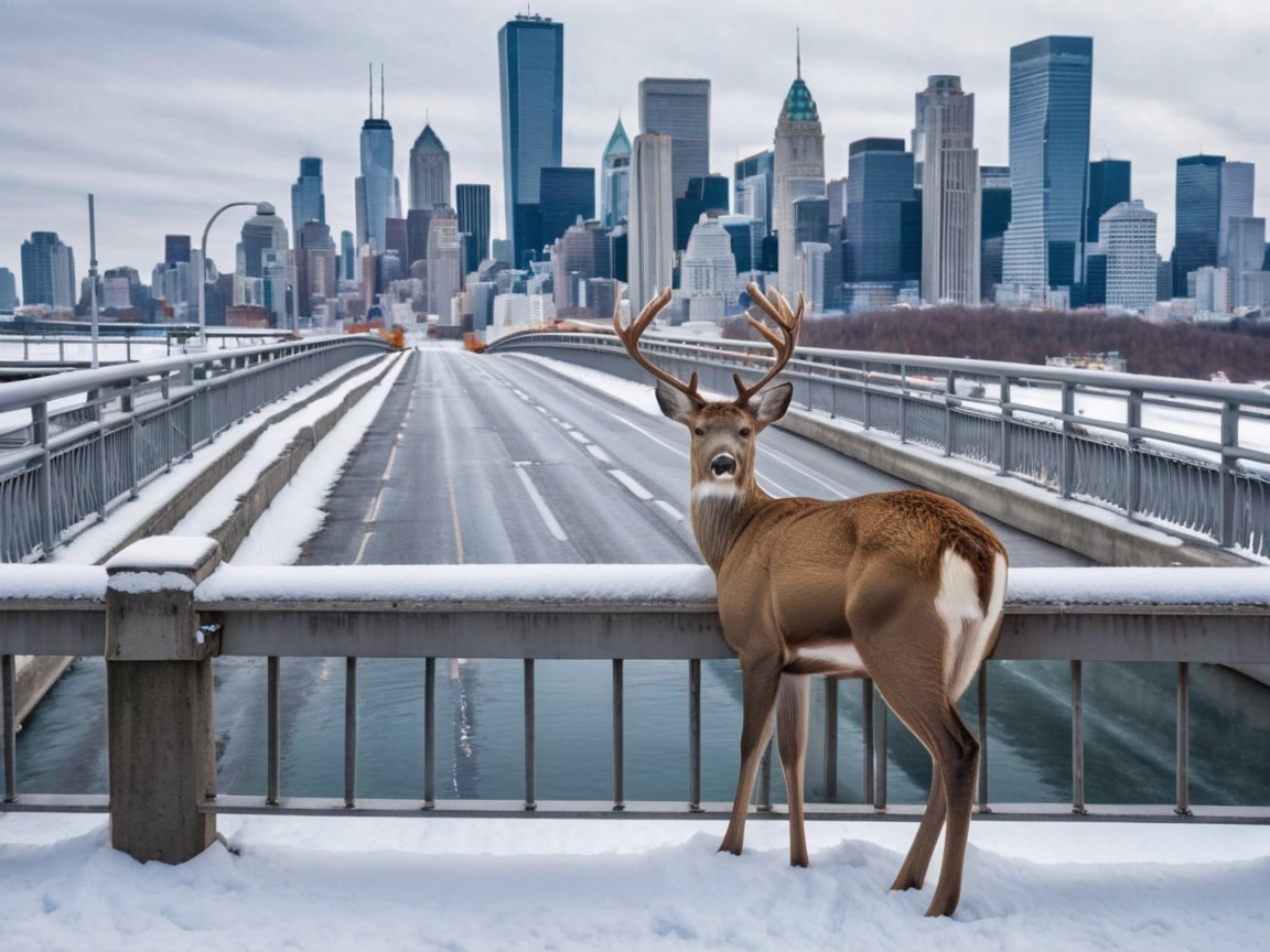 A deer stands on a snowy bridge, looking towards a city skyline filled with modern skyscrapers under a gray sky, creating a striking contrast between nature and urban life.