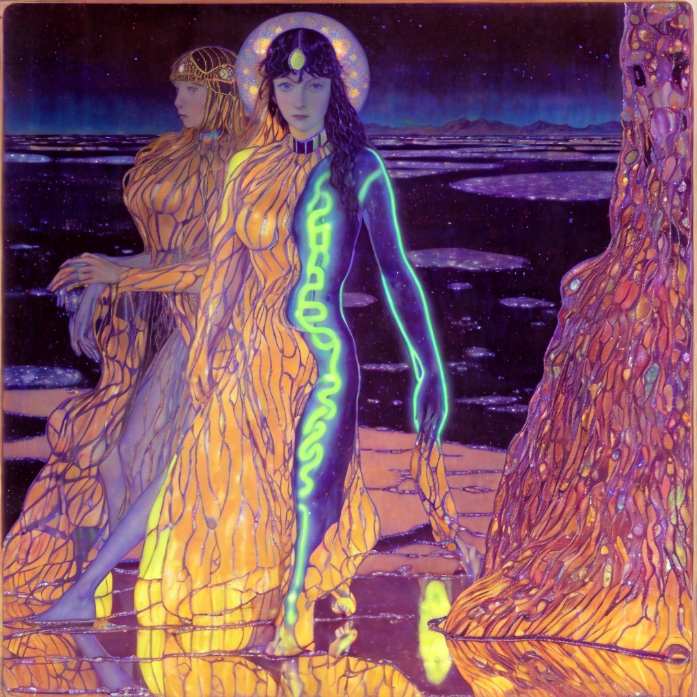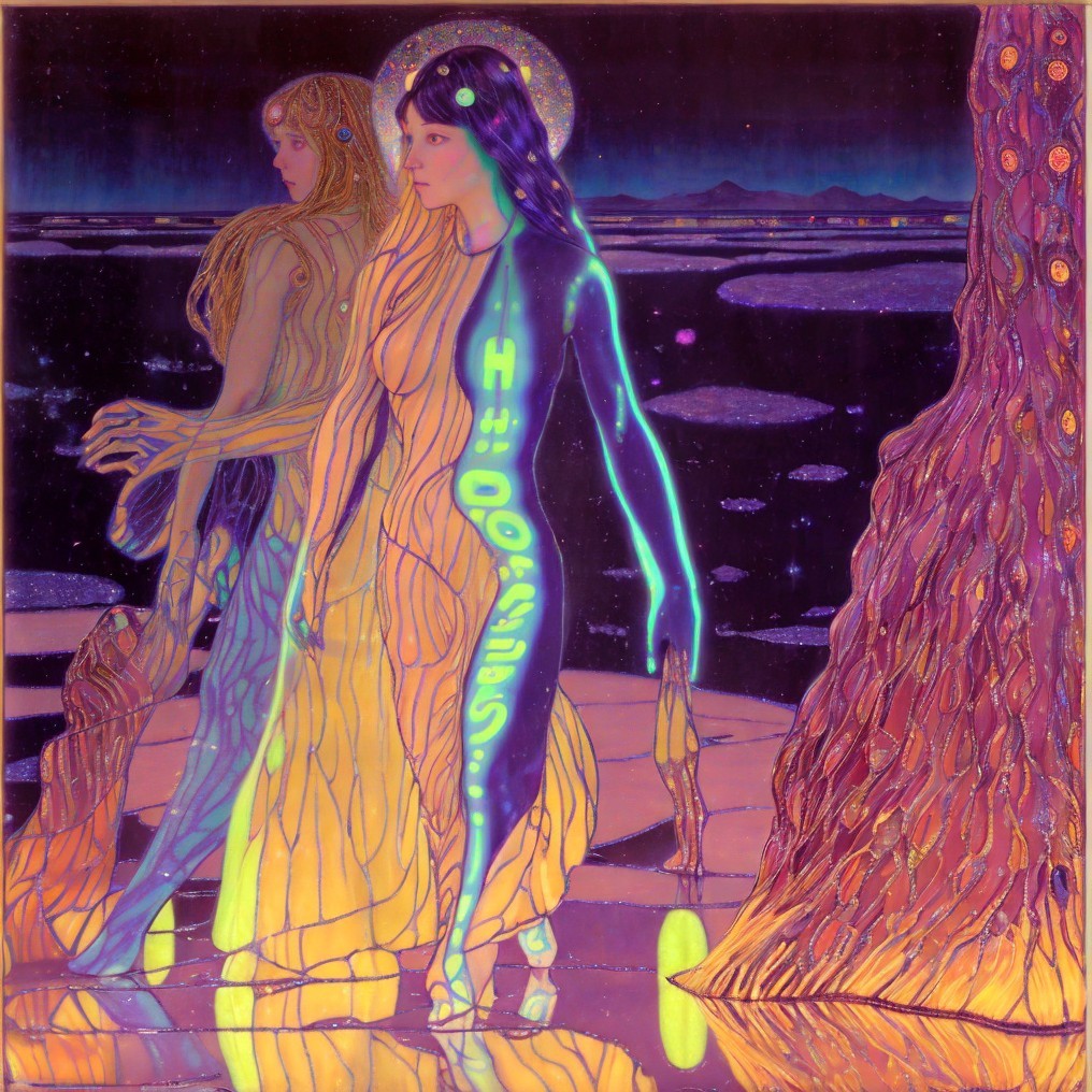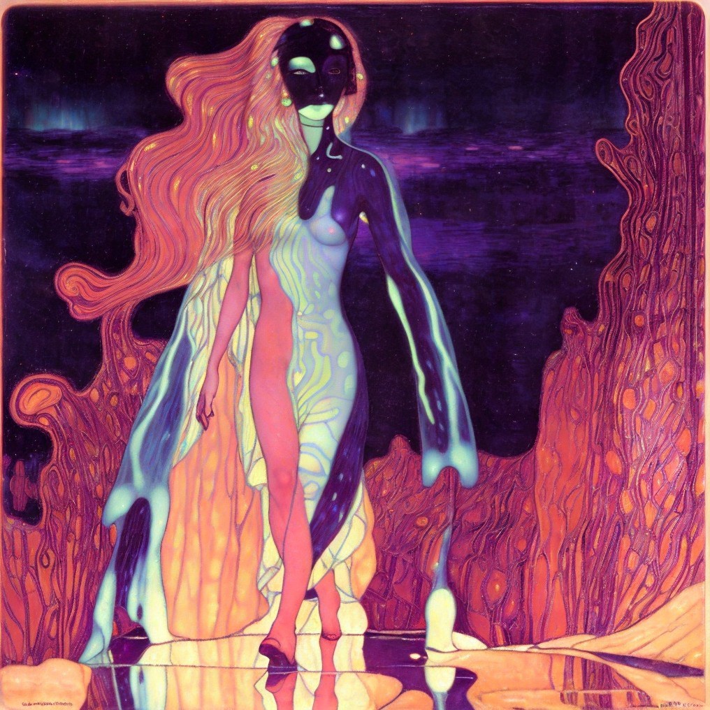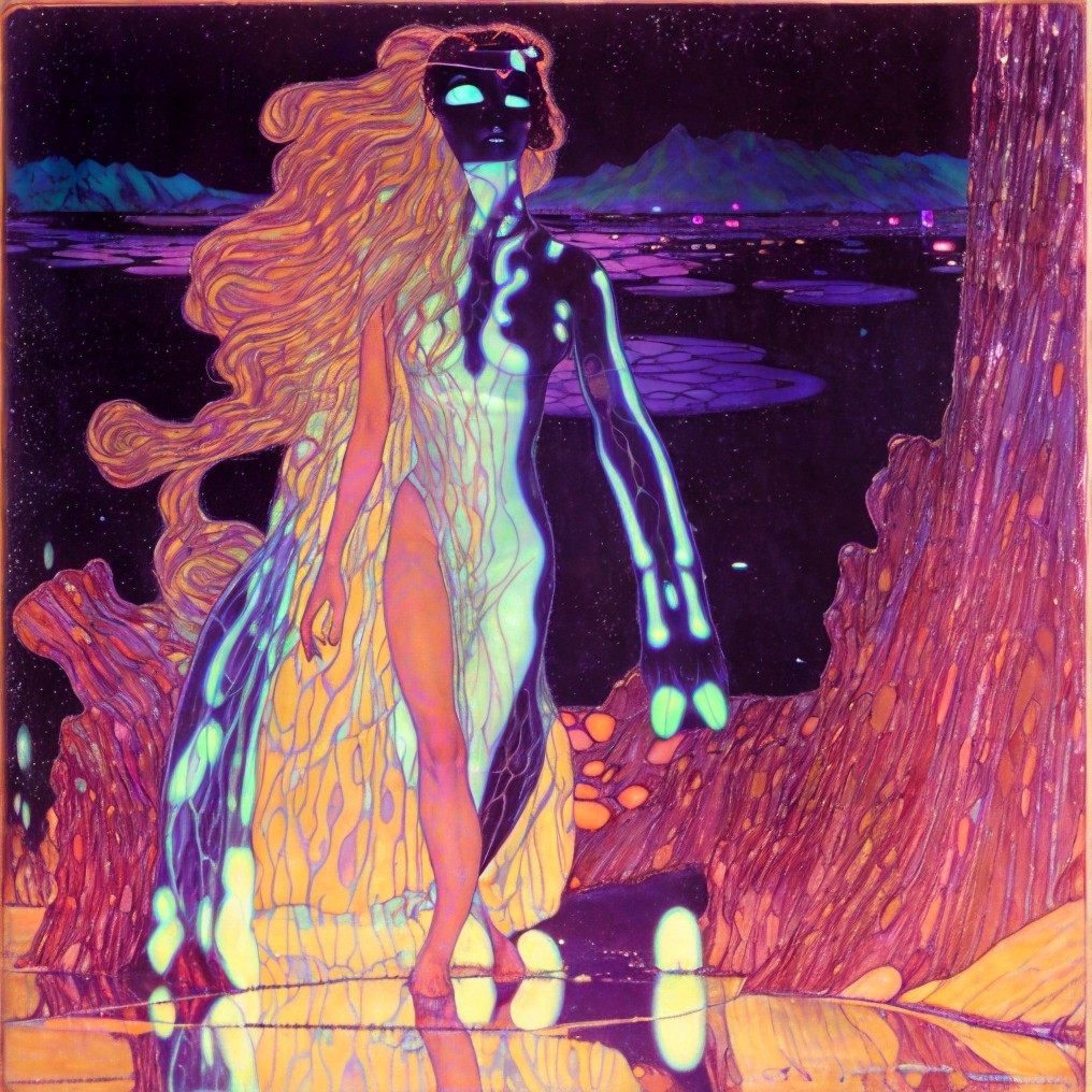 Ethereal woman with golden hair in cosmic setting