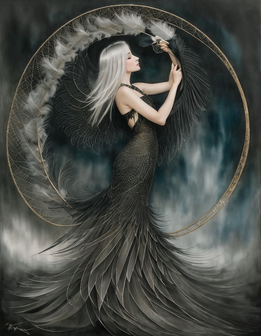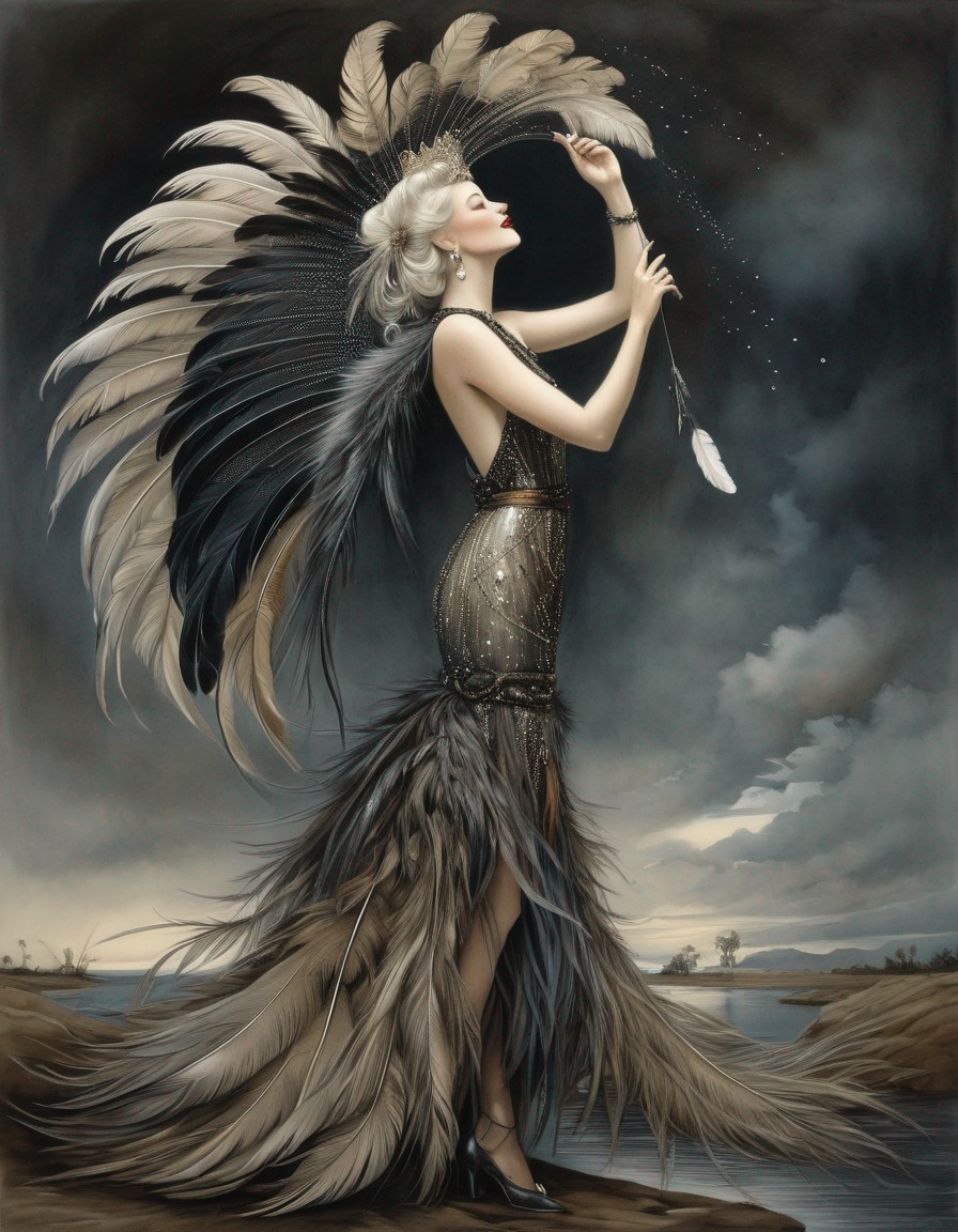 A woman in a feathered gown stands by a waterside, looking up; her attire blends with a bird nearby, evoking a fusion of human and avian elegance.