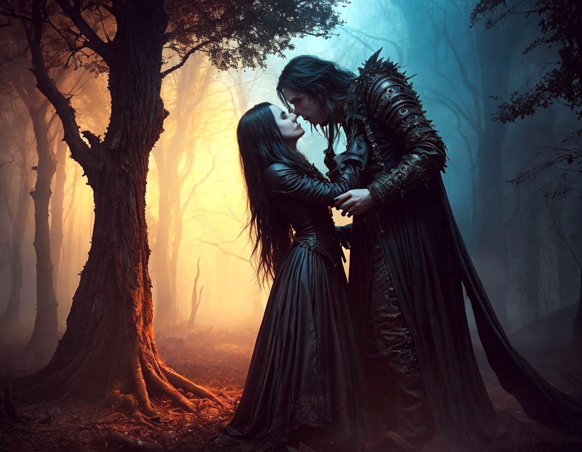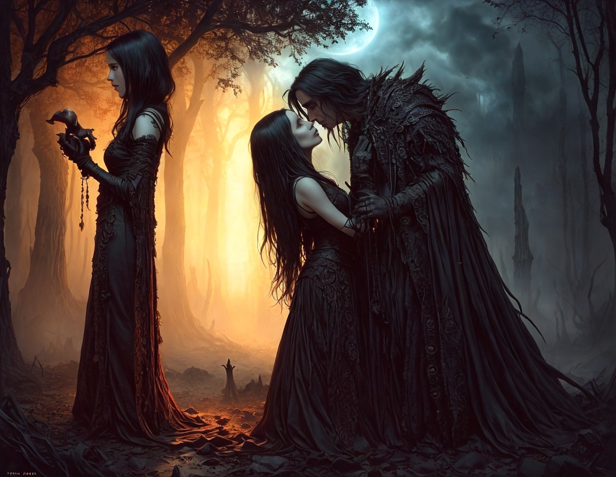 Woman with striking features next to hooded figure in metallic skull mask, lightning and fiery glow.