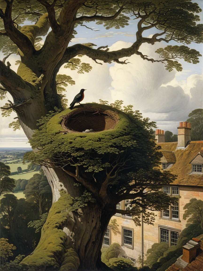 Prompt: "A dramatic view, from above, of an upper branch of an old growth tree with a bird in its small nest near the top, and below, in the background, the house and roof top of an English country estate.