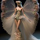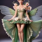 A whimsical fairy figure adorned in a lush, green costume, featuring delicate wings and floral decorations. She exudes enchantment, blending elegance with a playful, magical essence.