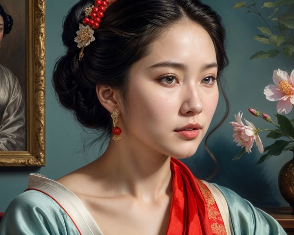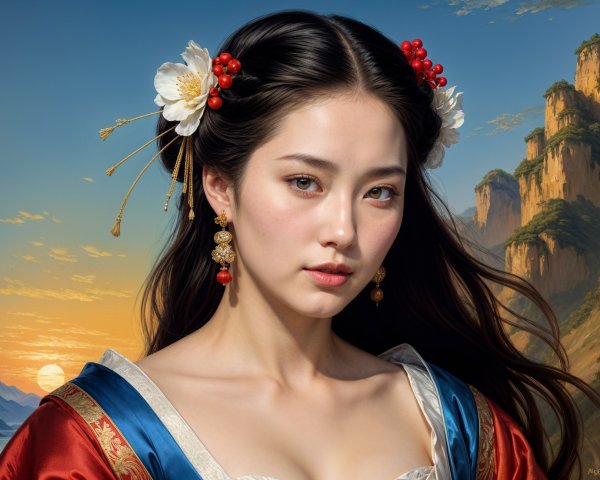 A stylish corgi sits on icy terrain, wearing a blue coat and a hat. The landscape features mountains and a serene lake, creating a whimsical and adventurous atmosphere.