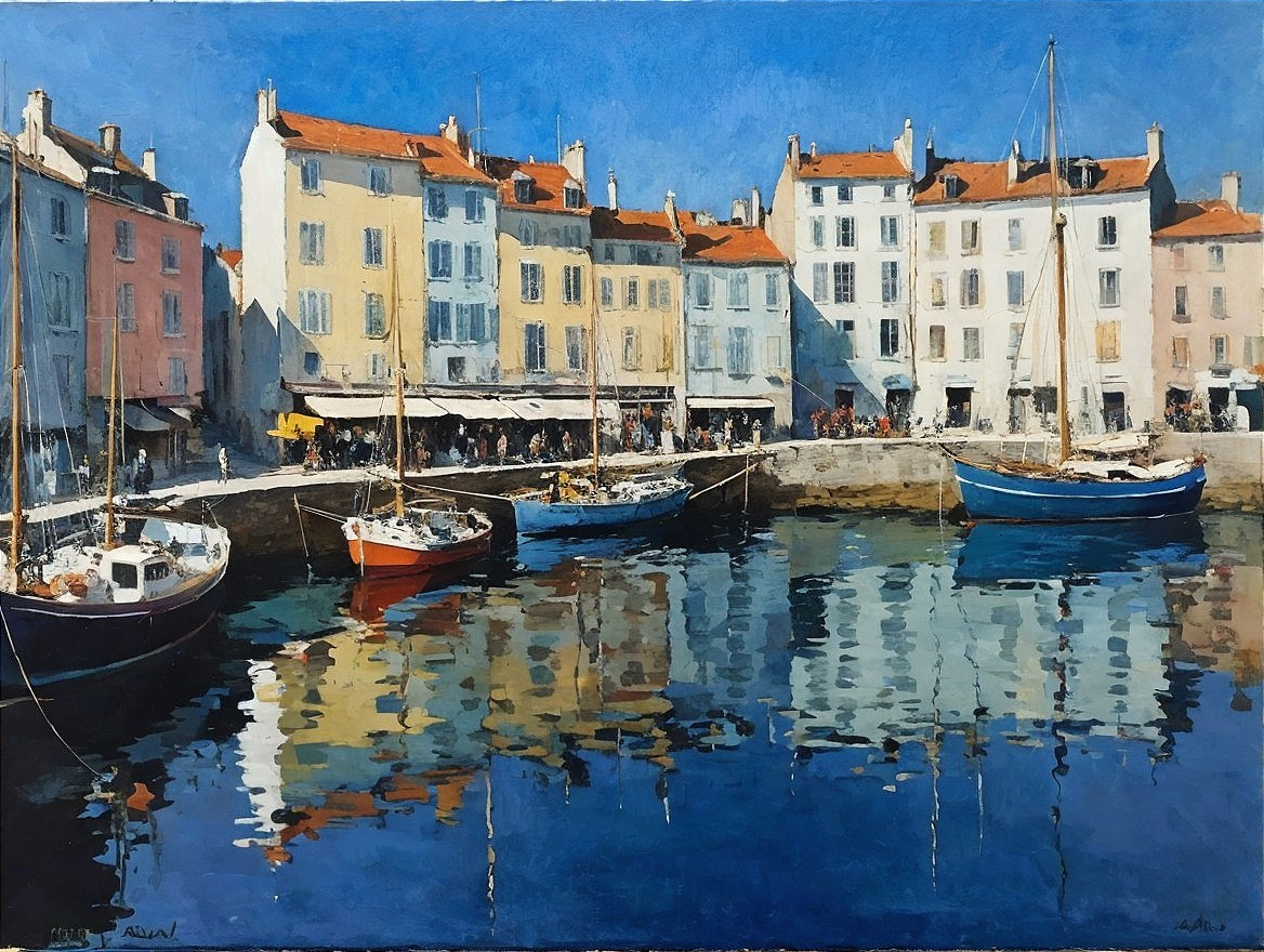 Vibrant Coastal Scene with Colorful Boats and Buildings