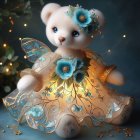 A whimsical white bear with large blue eyes sits gracefully, adorned in a delicate, light-up dress decorated with flowers and fairy wings, creating a magical, enchanting vibe.