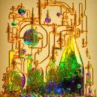 A vibrant display of laboratory glassware filled with colorful liquids in shades of green, blue, yellow, and purple. Bubbles and swirling colors create a dynamic, lively atmosphere.