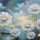 Prompt: Drooping white and yellow dandelion, ink drawing and watercolour. Hazy smoky indistinct background, background blue white tone, great golden sunset, starry night, embossed textur, art van Gogh