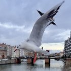 A white bird soars over a serene waterway lined with historic buildings, their colorful facades reflecting on the calm surface. Soft, moody skies enhance the tranquil atmosphere.