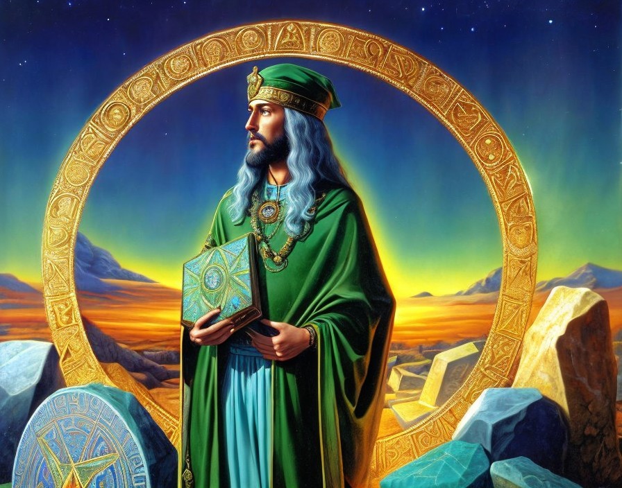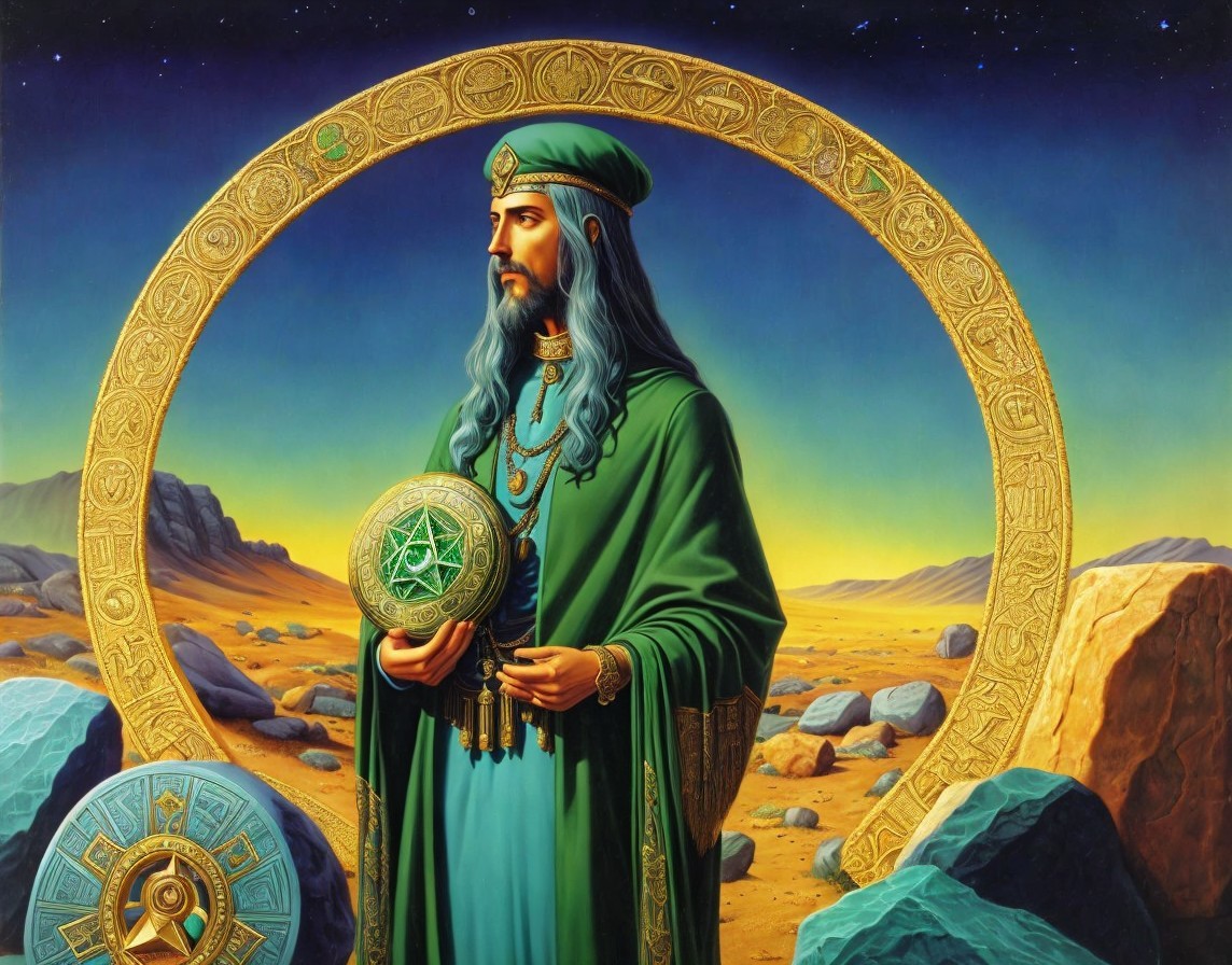 A painting of a robed man with a book and staff before a circular symbol, set in a desert-like landscape.
