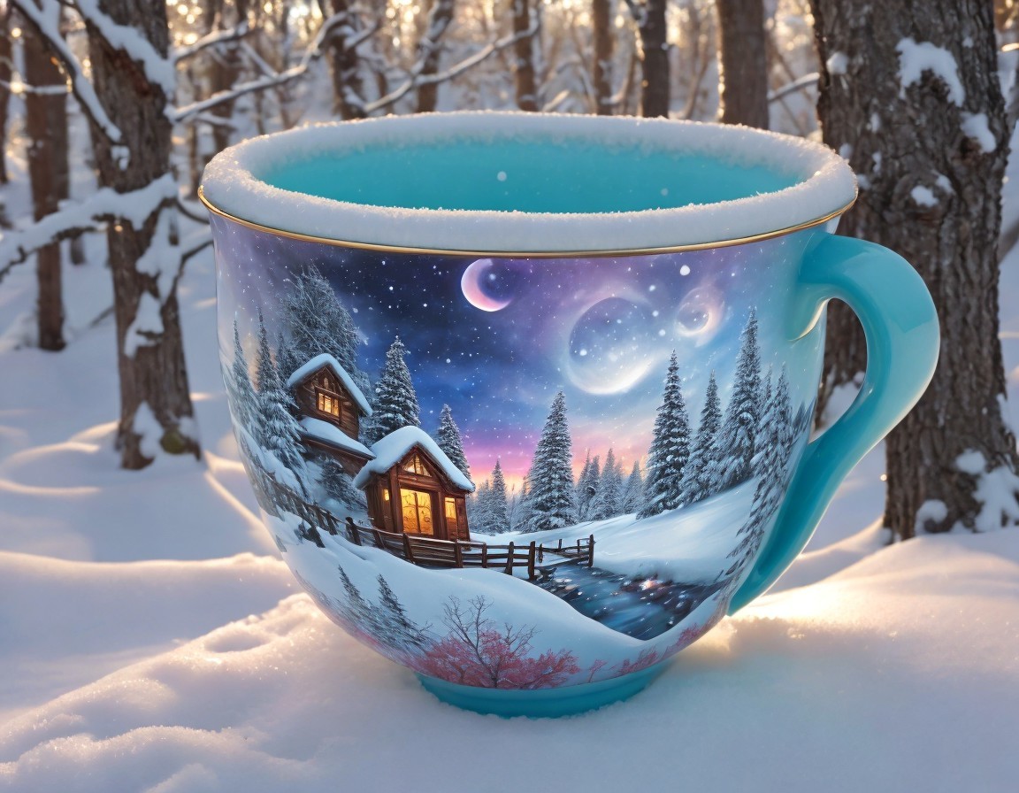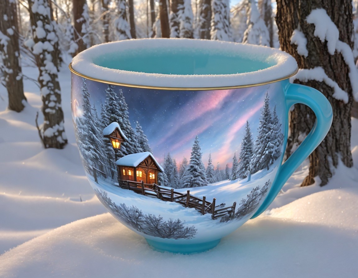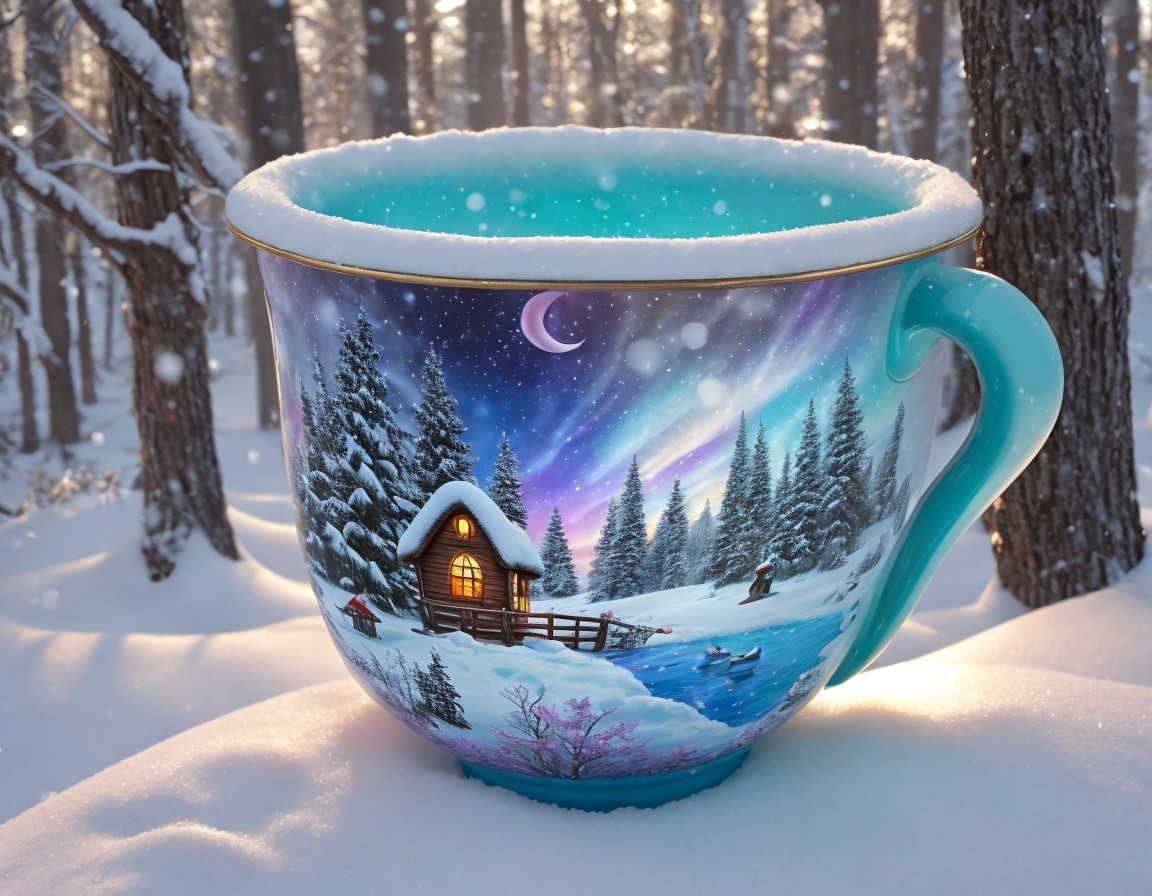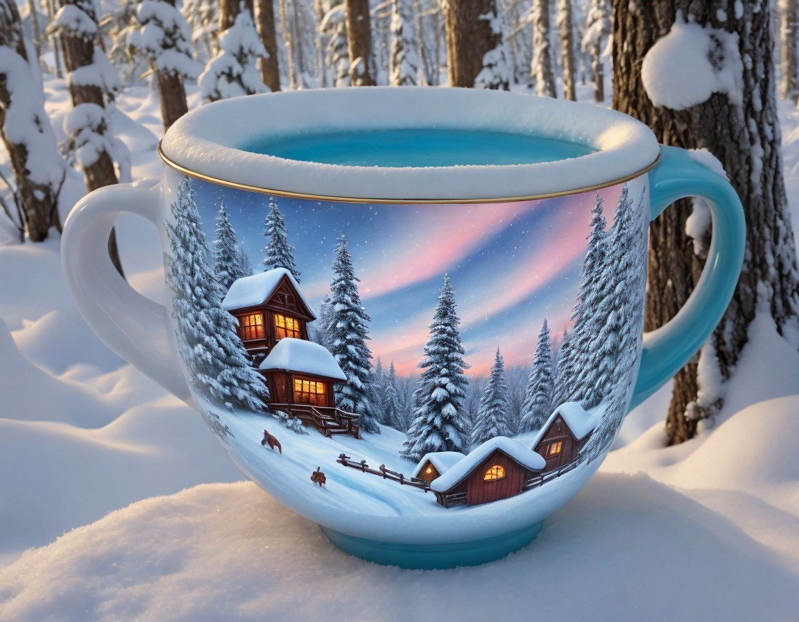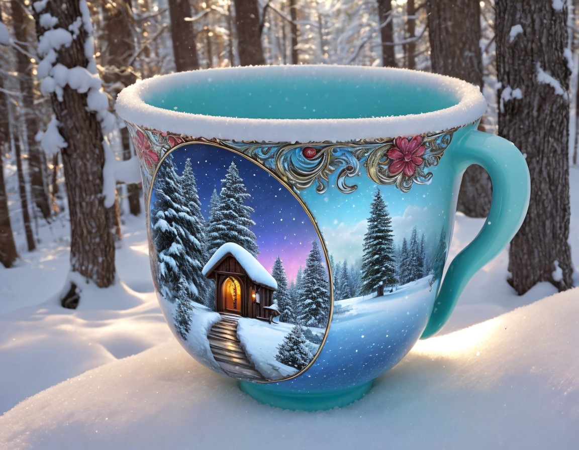 A large, vividly painted mug features a winter scene with cozy cabins nestled among snow-covered trees, illuminated by a soft sunset glow, set against a serene snowy landscape.
