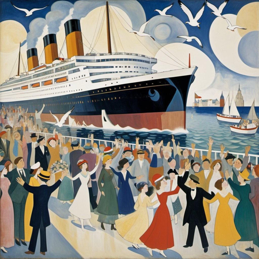 A vibrant painting depicts a crowd of people waving at a large ocean liner with billowing smokestacks, surrounded by seagulls under a sunny sky.