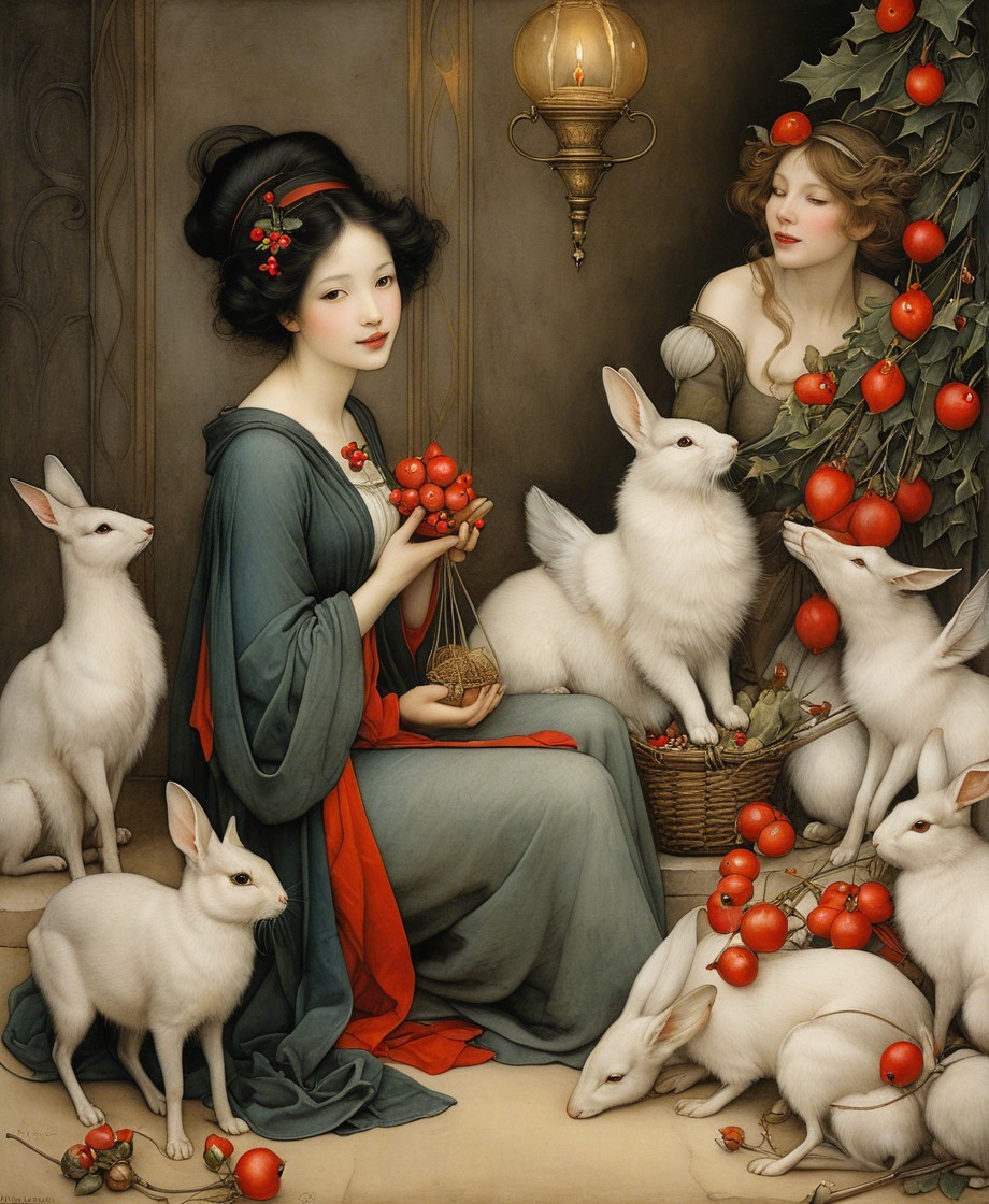 A serene woman in a flowing gown sits by a festive tree adorned with ornaments, surrounded by white rabbits. She holds red apples, exuding a whimsical, holiday charm.
