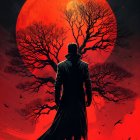 A cloaked figure stands before a large, glowing full moon, surrounded by eerie, leafless trees. The atmosphere is dark and dramatic, with vibrant colors enhancing the ominous scene.