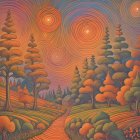 A vibrant landscape featuring swirling orange skies and three circular suns. Lush trees and rolling hills in warm tones frame a winding path leading to a quaint house amidst colorful autumn foliage.