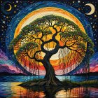 A swirling artwork: a willow tree silhouetted against a radiant sunset. Stars and a moon illuminate the night sky, reflecting on the waters below. Prompt by Crystaldelic applied to my original willow tree.