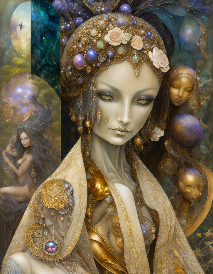 An ethereal female figure wearing an intricate, ornate helmet adorned with celestial motifs, her piercing gaze set against a starry backdrop.