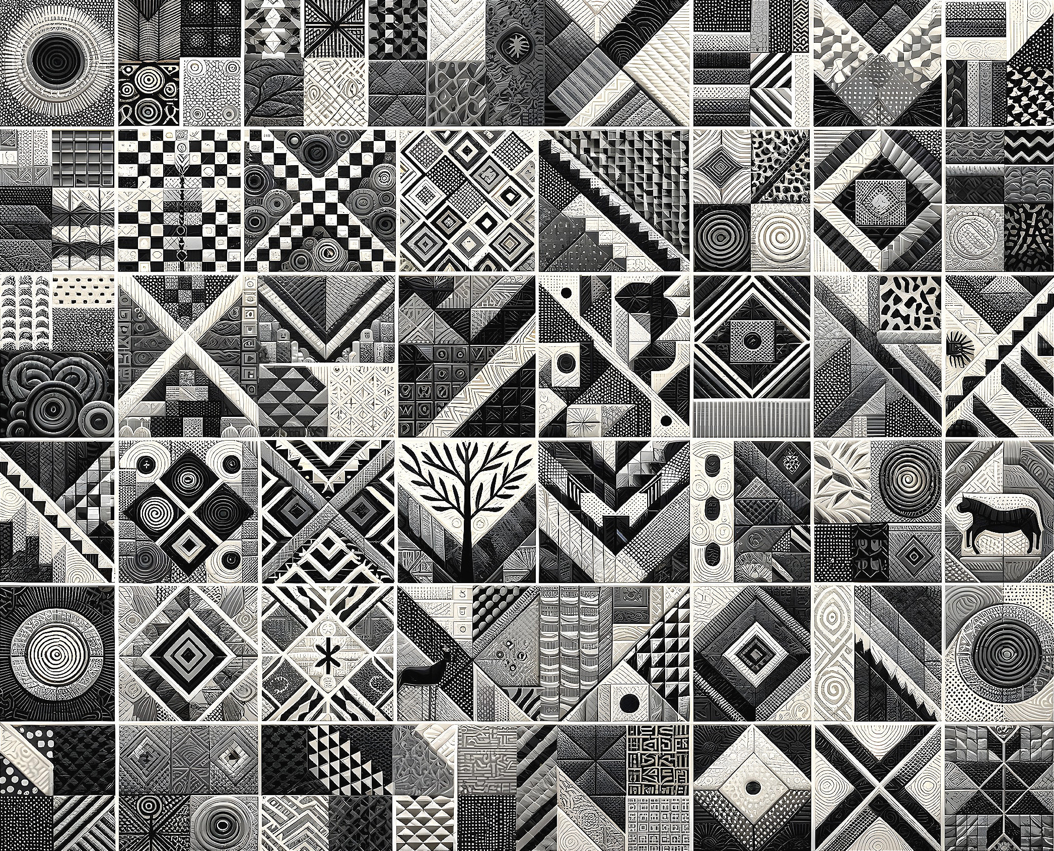 A monochrome patchwork of various patterns and illustrations, with geometric shapes, animals, and nature themes, forming a quilt-like design.